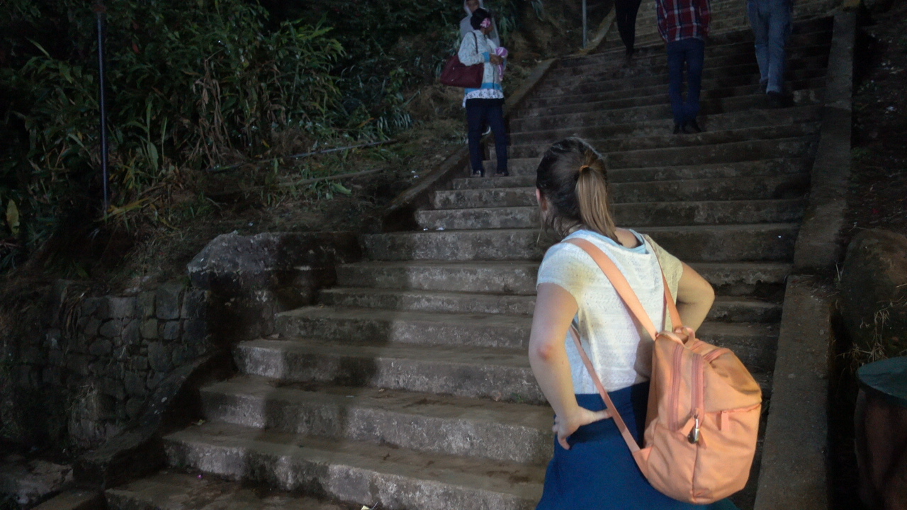 Alors que la 1ère heure de montée se fait facilement, la 2ème est plus raide. Les escaliers étant complètement irréguliers, impossible d’avoir un rythme constant, donc on s’arrête souvent pour reprendre notre souffle, boire et manger un peu. La dernière demi-heure de montée, nous avons encore 400m de dénivelé à monter … l’envie d’abandonner est proche mais nous tenons bon !